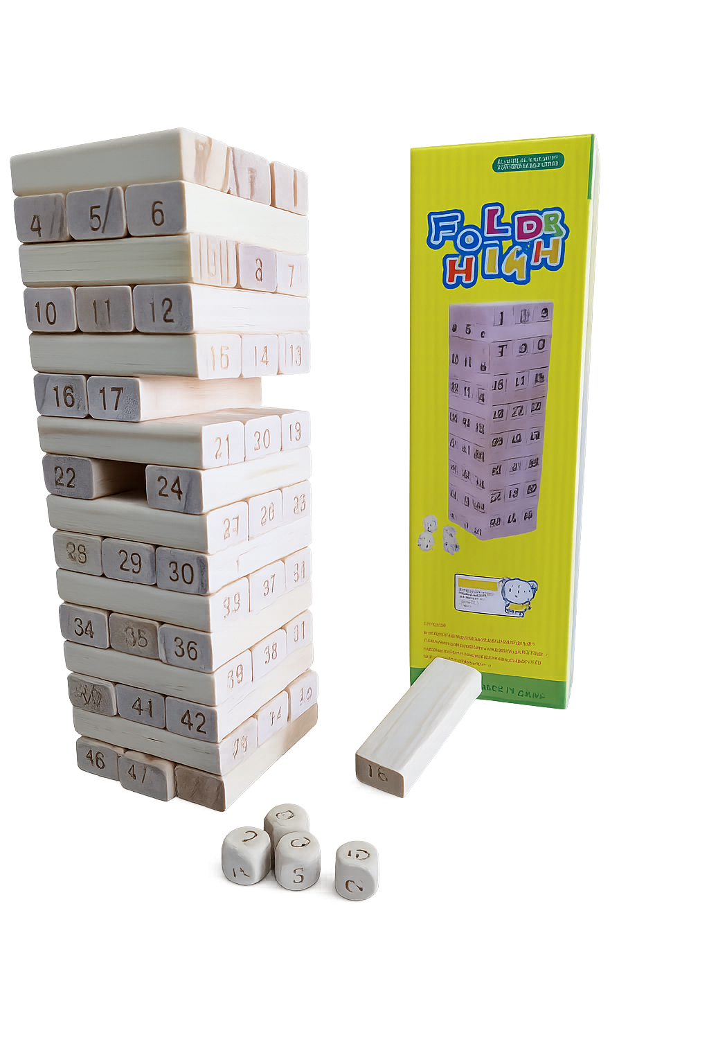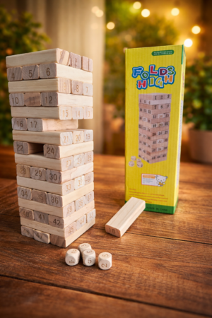 Παιχνίδι στοίβαξης σε κουτί , από ξύλο πεύκου 48τεμ. και 4 ζάρια. Διάσταση 7,5×2.5×1.5 cm.